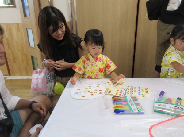 自分の好きなようにお絵描きしたり、シールを貼ったりしてコマとうちわを作って楽しみました。