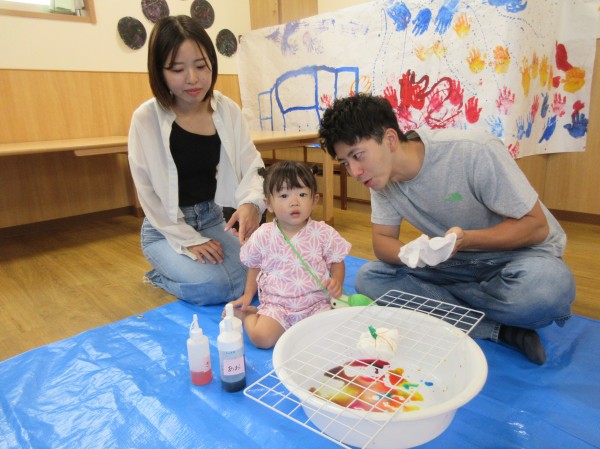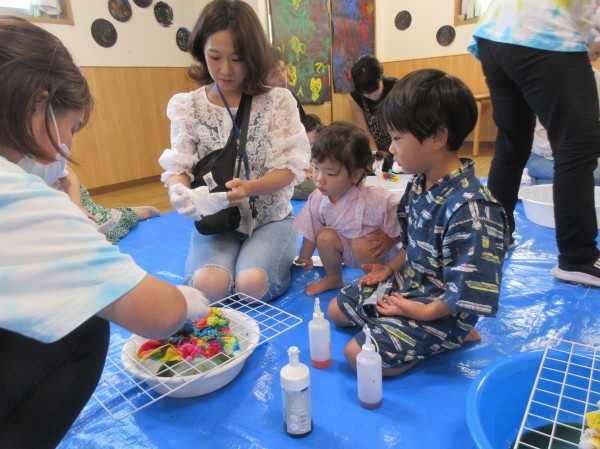 こんにちは‼たんぽぽ海神町南保育園です。いつも保育園ブログをご覧いただきありがとうございます。今回は夏祭りで行ったタイダイ染めの様子を掲載いたします。