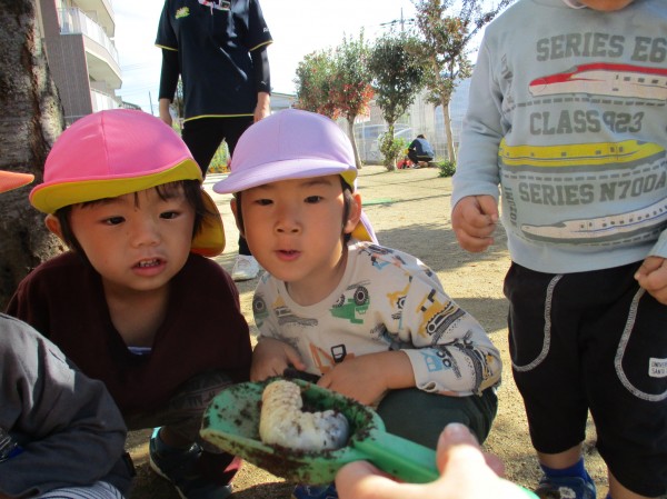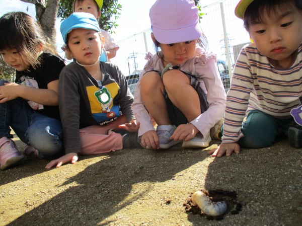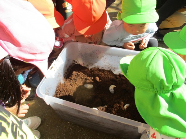「おおきい~!!」「白いね」「くねくね動いてる!」と、幼虫を見て大興奮の子どもたち(*^^*)