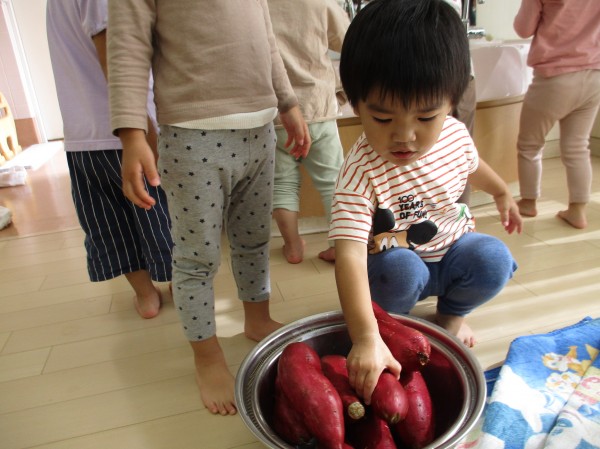 みんなが綺麗にしたさつまいもは、おやつのスイートポテトになりました。嬉しそうに食べていた子どもたちです。