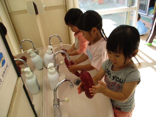 大きなさつまいもに興味津々の様子。一人ひとつ、さつまいもを洗います。落とさないように、よ~く洗って・・・ごしごしごし。真剣な表情です。