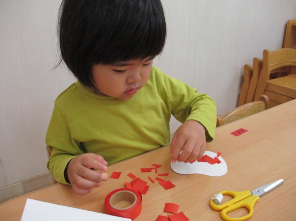 先日、初めてハサミを使った製作を行ったらっこ組。今回は、ハサミを使ってりんごを作った子どもたちの様子をお届けします(^^♪
