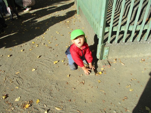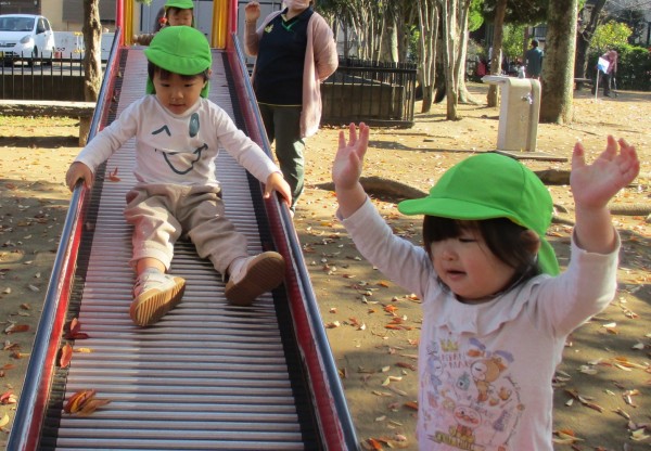 公園に着くと落ち葉に触れたり公園中を探索したり滑り台で遊びました。
