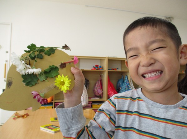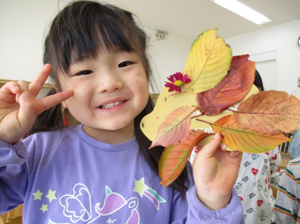 少し前のお話ですが、保育園の周りにはたくさん落ち葉やお花があり、自然物を使ってハリネズミを作りました。