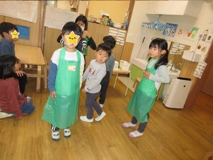 お店屋さんで身につける物も実際に着てみて明日のお店屋さんごっこに期待を膨らませていた子どもたちなのでした。