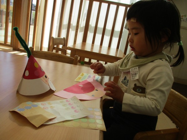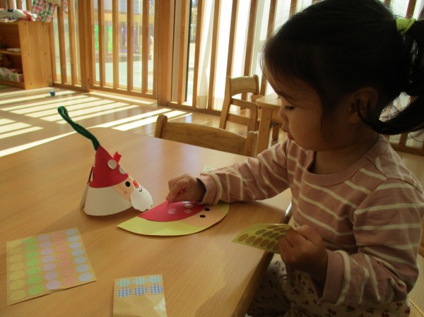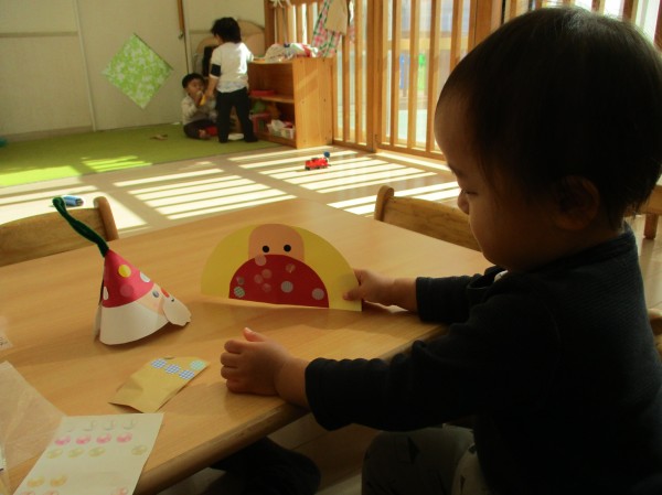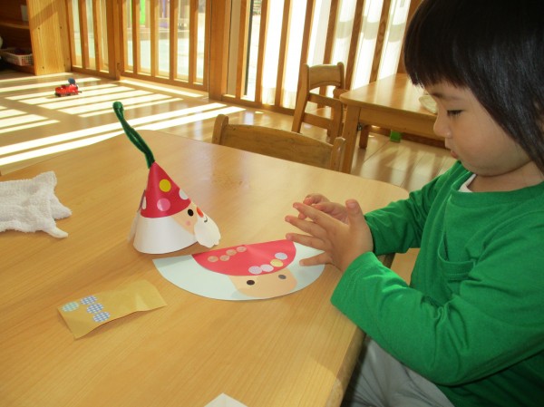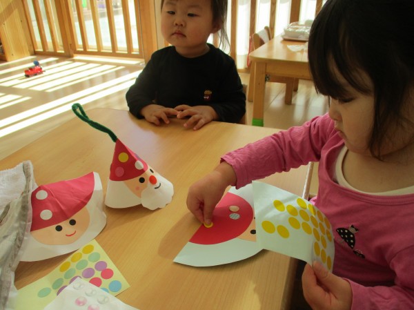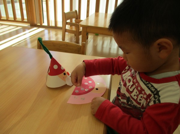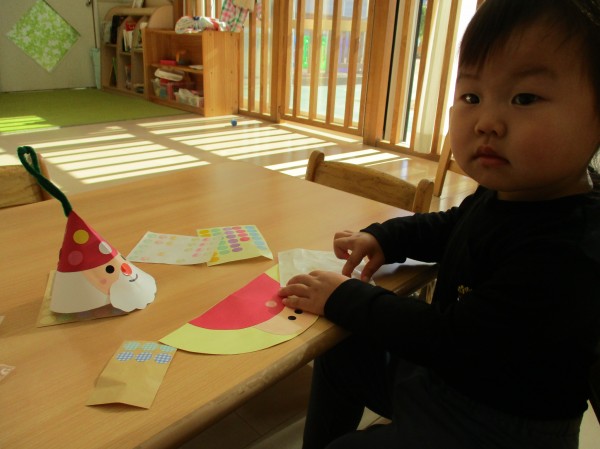 オーナメントはサンタさんをモチーフにパーツをシールで貼りしました。シールが上手くはがれなかったり、貼ったと思ったら指にくっついたりといろいろ苦戦していましたが、一生懸命貼っていました。