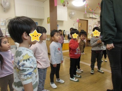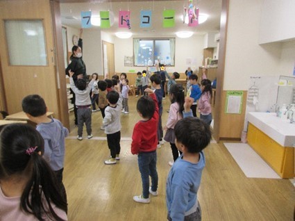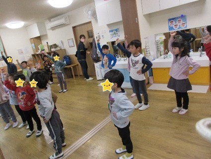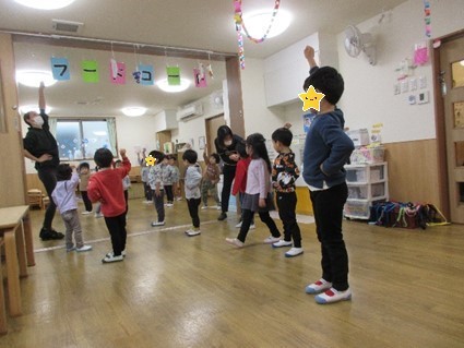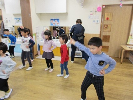 今日は川本さんによるダンスを楽しみました。ドラえもんのクリスマスの曲やポケモンの曲を聞いて大喜びの子ども達。速い振り付けのところも一生懸命追いつきながら楽しんでいました。