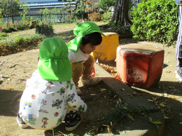 散歩の公園の遊具で遊ぶのも好きな子どもたちですが、園庭とは違う場所に興味津々。探索も楽しんでいます。