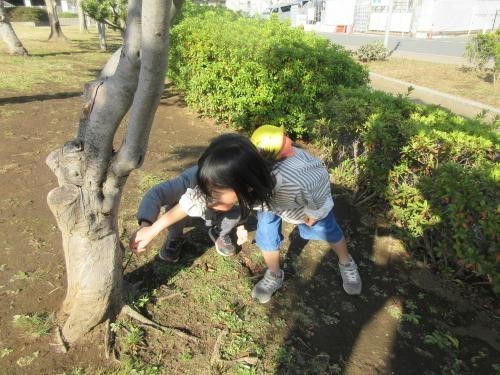 近隣公園へ久しぶりに行ったことが嬉しい様子を見せていた子どもたち。氷鬼をする子や、木登りをする子、木をよく観察して樹液があることや、冬眠している虫を発見していました。