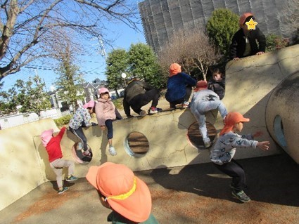 公園ではすべり台をお友だちと「せーの」で一緒に滑ったり公園内を探検したりと楽しんでいた子どもたちです。