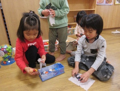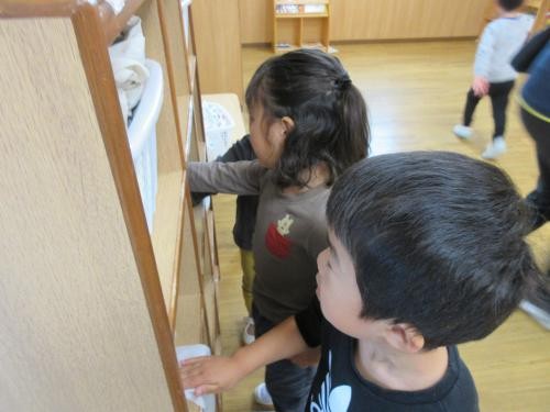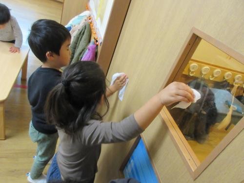 おもちゃ拭きや絵本の整理整頓は子どもたちの方から気づいてお掃除を始めていて感心です。