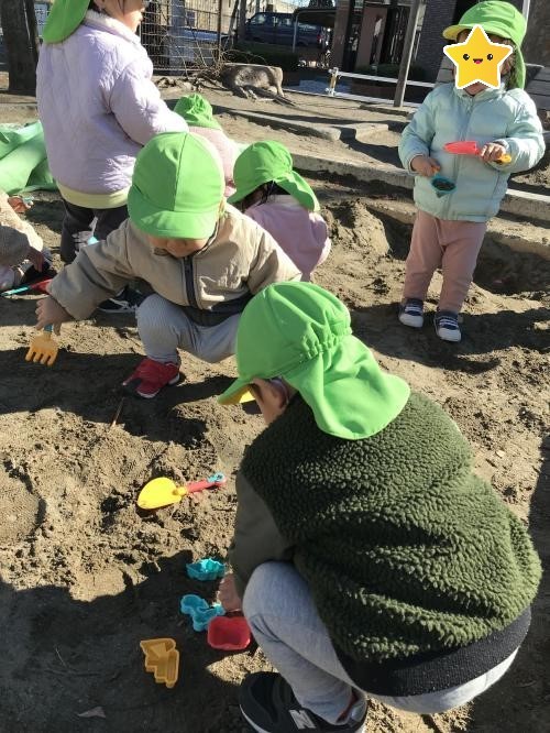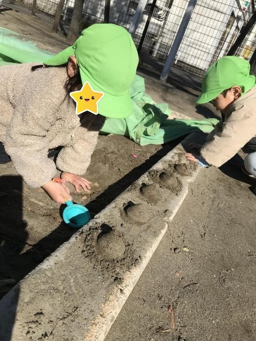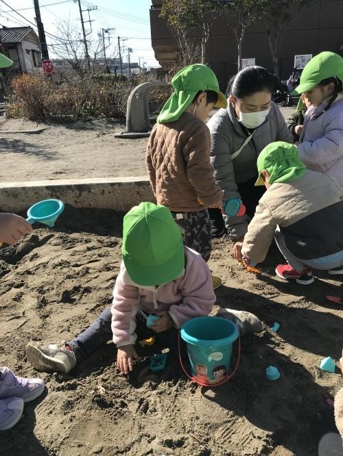 電車型や三角形などの小さな器に上手に砂を入れて遊ぶ姿や、バケツに山盛りの砂を入れてごはんを作る姿などが見られました。