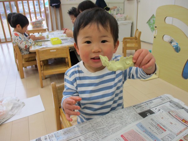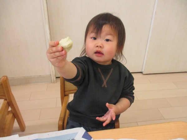 こねる度に形が変わることが面白く、しばらく集中して遊び続けていた子ども達。あっという間に給食となり、おしまいの時間に。まだやりたいな、と名残惜しそうな様子があるほどでした。またお部屋で遊ぶ時には粘土遊びをしましょうね♪