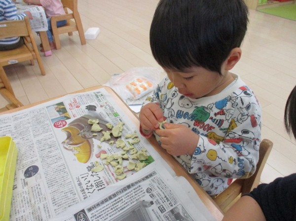 粘土をこねたり、小さくちぎったり、形の変化や感触を楽しんでいます。指先を上手に使ってこねこねと、もう夢中です(*^▽^*)