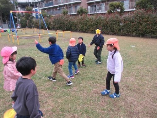 体が暖かくなった後は自由遊び。サッカー、しっぽ取り、ピクミンごっこなどそれぞれ遊びました。