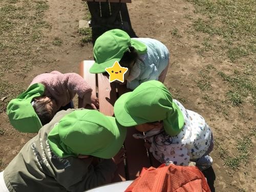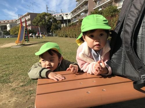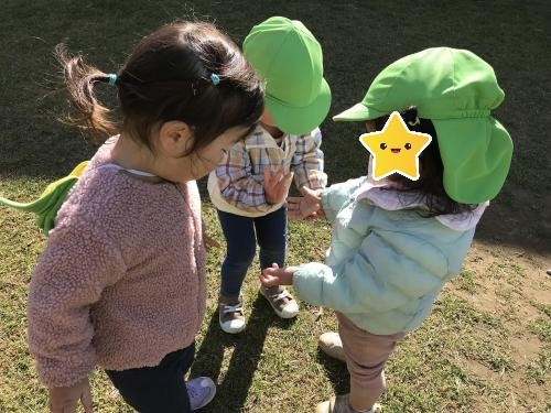 「あつい!」「汗かいたー!」と上着を脱ぎ出す子もたくさんいました。拾ったドングリでお店屋さんごっこをしたり、保育者と追いかけっこをしたりして遊んできました。