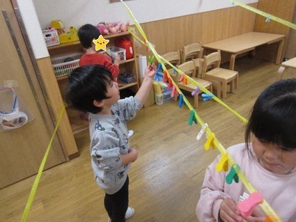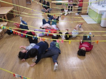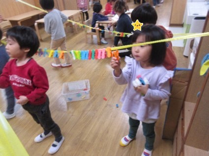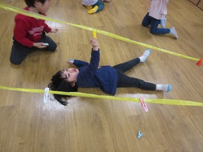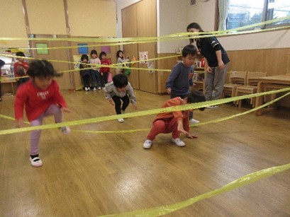 スズランテープにたくさんの洗濯ばさみをくっつけ、高いところは背伸びをしながら、低いところは寝転びながらと態勢を工夫しながら楽しんでいました。スズランテープに当たらないようまたいだりくぐったりしながらゴールし大喜びの子どもたち。