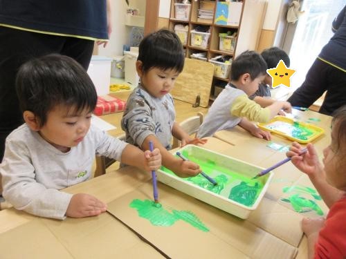 製作(絵の具)~散歩(体操、しっぽ取り)