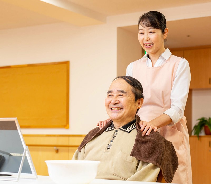 シニアセラピーは、「ご利用者様に毎日をいきいきと過ごしていただきたい」という願いを込めてスタートした、オリジナルの癒しのサービスです。高齢者向けにアレンジした「リンパドレナージュ」により、足や顔に心地よい刺激を与え、『心と身体の両面』の健康を目的としています。