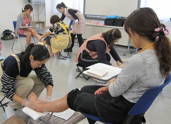 座学ではリンパの構造や機能について学びます。また高齢者の足の特性を知ることで、施術の大切さを学んでいただきます。