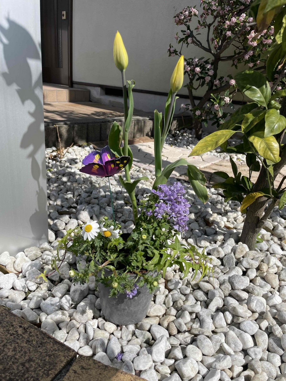 背の高いチューリップを主役にすべく頑張ってみました。蝶々は飾りで入れましたが可愛いアクセントになりました。