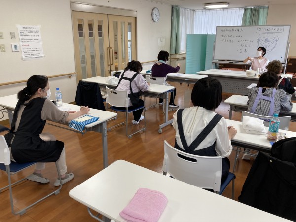 座学では介護が必要な方になぜシニアセラピーが必要なのか、高齢者のお肌の特性や保湿の重要性などなど、様々なことを学びます。そしてお互いにモデルになって実技を学びます。限られた時間の中で、受講生の皆様は本当に熱心に学んでくださっています。講師も熱が入りますね!!