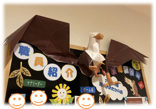 中に入ると職員紹介のボードがあり、ここに大きな鷹が飾ってあり、職員さんの手作りのようです。とっても見事でついつい写真を撮ってしまいました^^