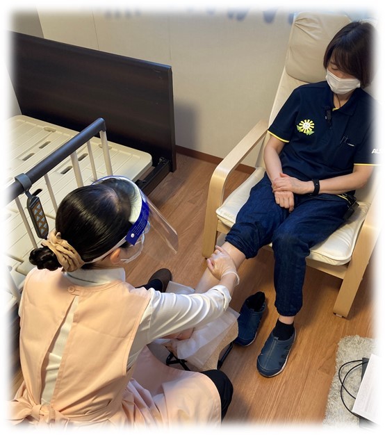 また、職員さんにも体験を受けていただきました。ケアリーダーの方です。施術が終わったときには、『足が軽くなった!!』と感動してくださいました。お写真を撮ってくださったのはナースさんで、シニアセラピーのご説明を聞いていただきながらの撮影でした。