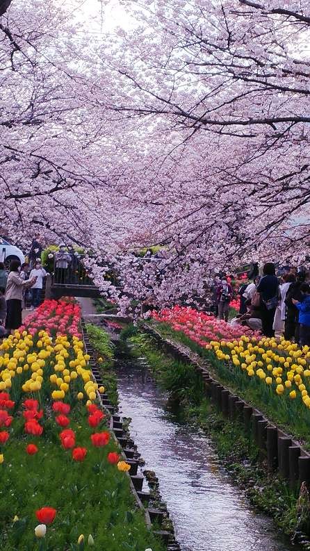 満開の桜とチューリップの共演が見られる珍しい絶景をご覧ください。