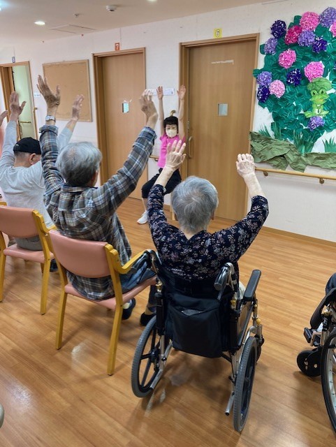 介護施設では考えられないようなアップテンポな曲を使用しからだを動かしています。